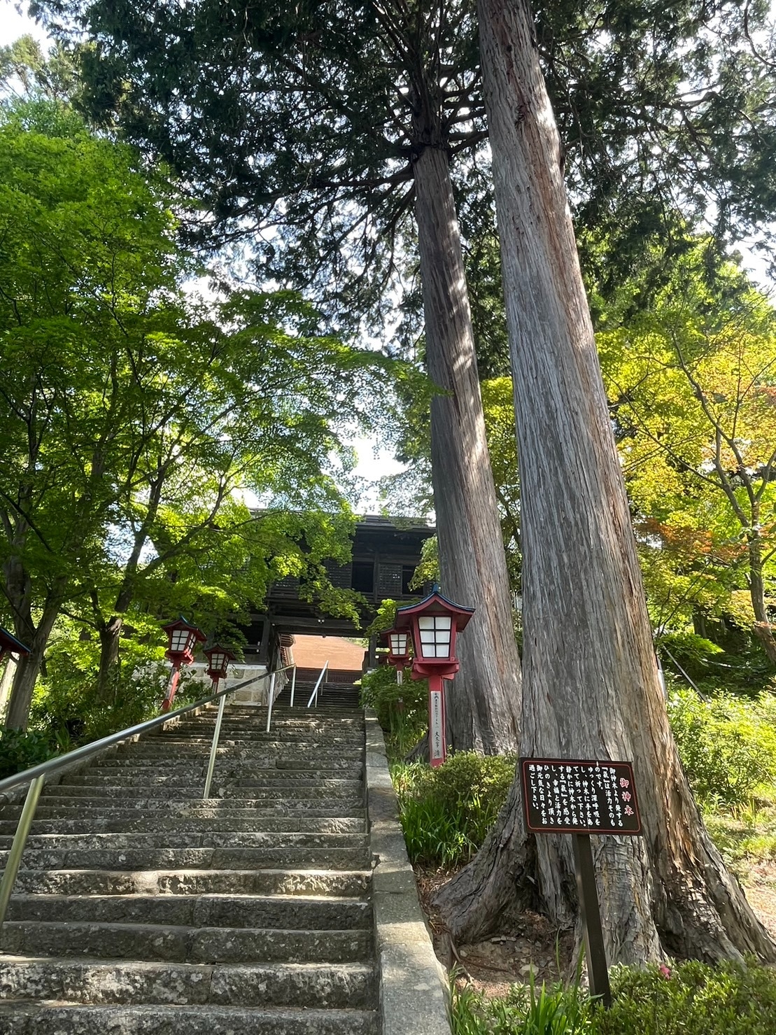 御神木に囲まれた石畳の階段を上ると本堂が見えてきます