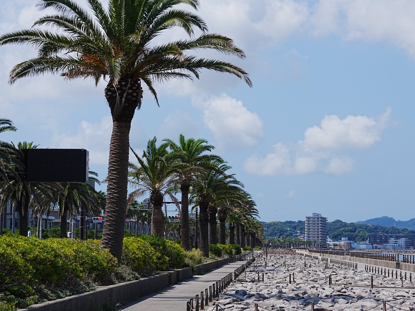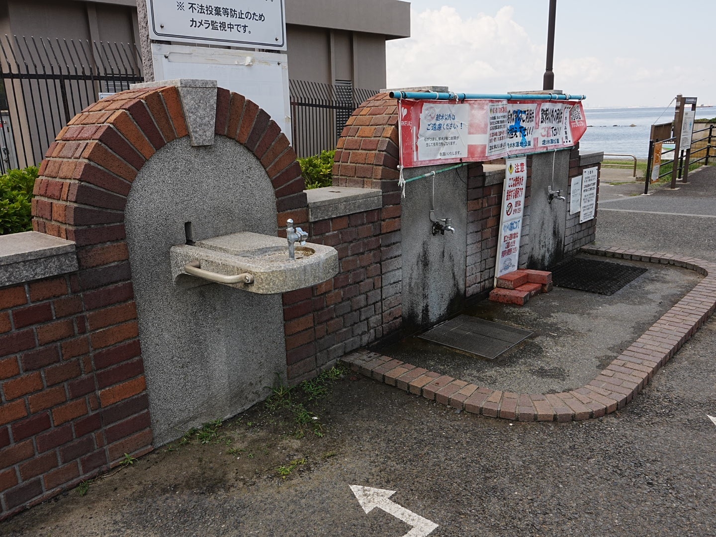 ▼走水神社から「馬堀海岸」のヤシの木並木まで足を延ばしました。ただし、神社から馬堀海岸までは3kmほどあるので、途中にある「走水水源地駐車場(420円/時間)」に車を止めて、そこから海沿いを歩きます。駐車場には「ヴェルニーの水」が湧き出ています。