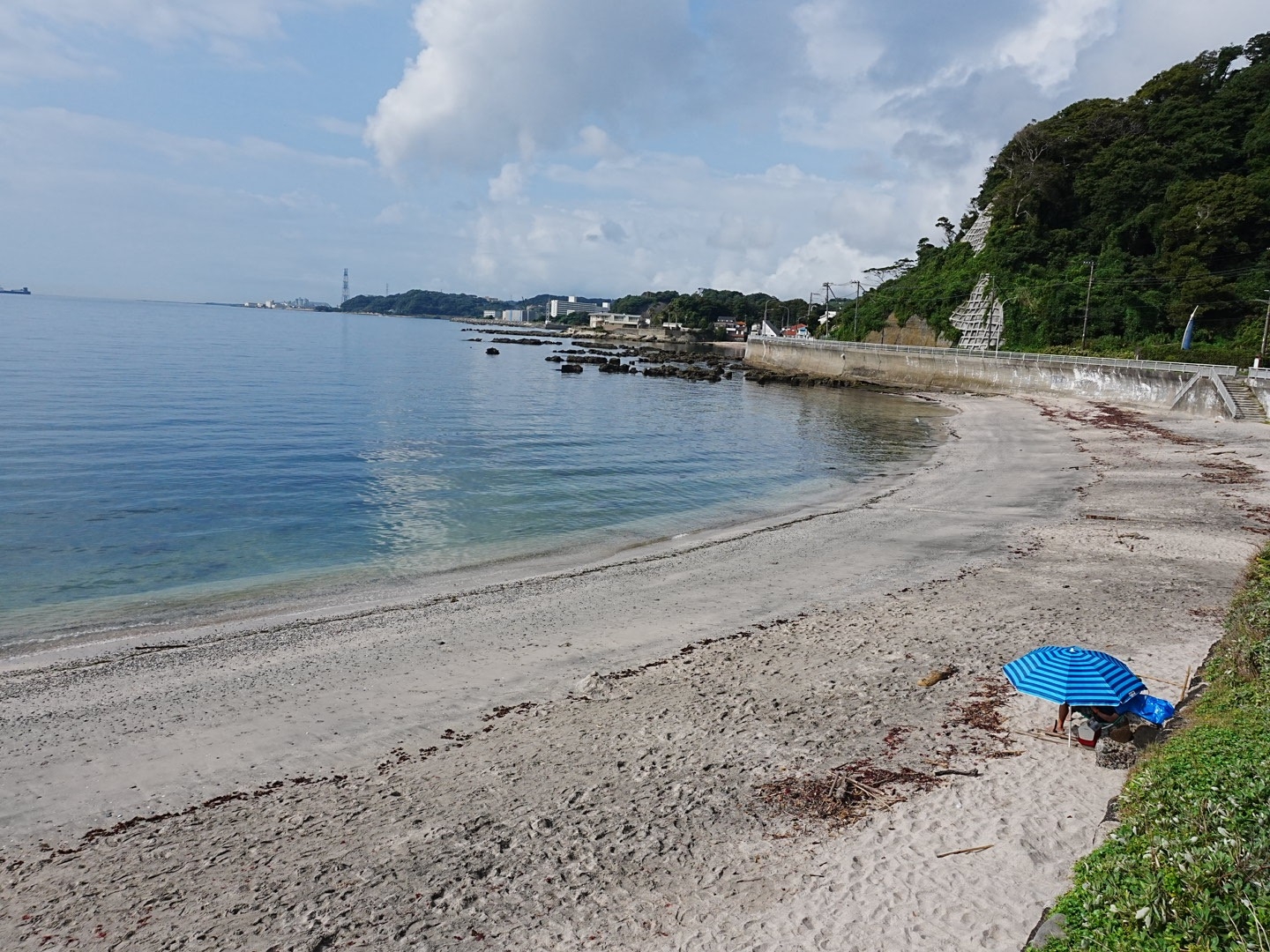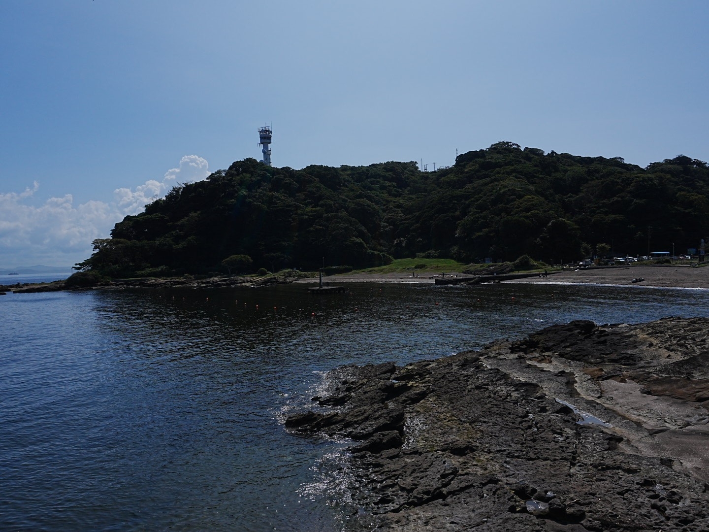 ▼観音崎園地。きれいな海です。砂浜だけでなく岩場もあって、磯遊びに最適♪ 写真右側に駐車場があります。平日は無料です。詳しくはコチラ→観音崎公園MAP