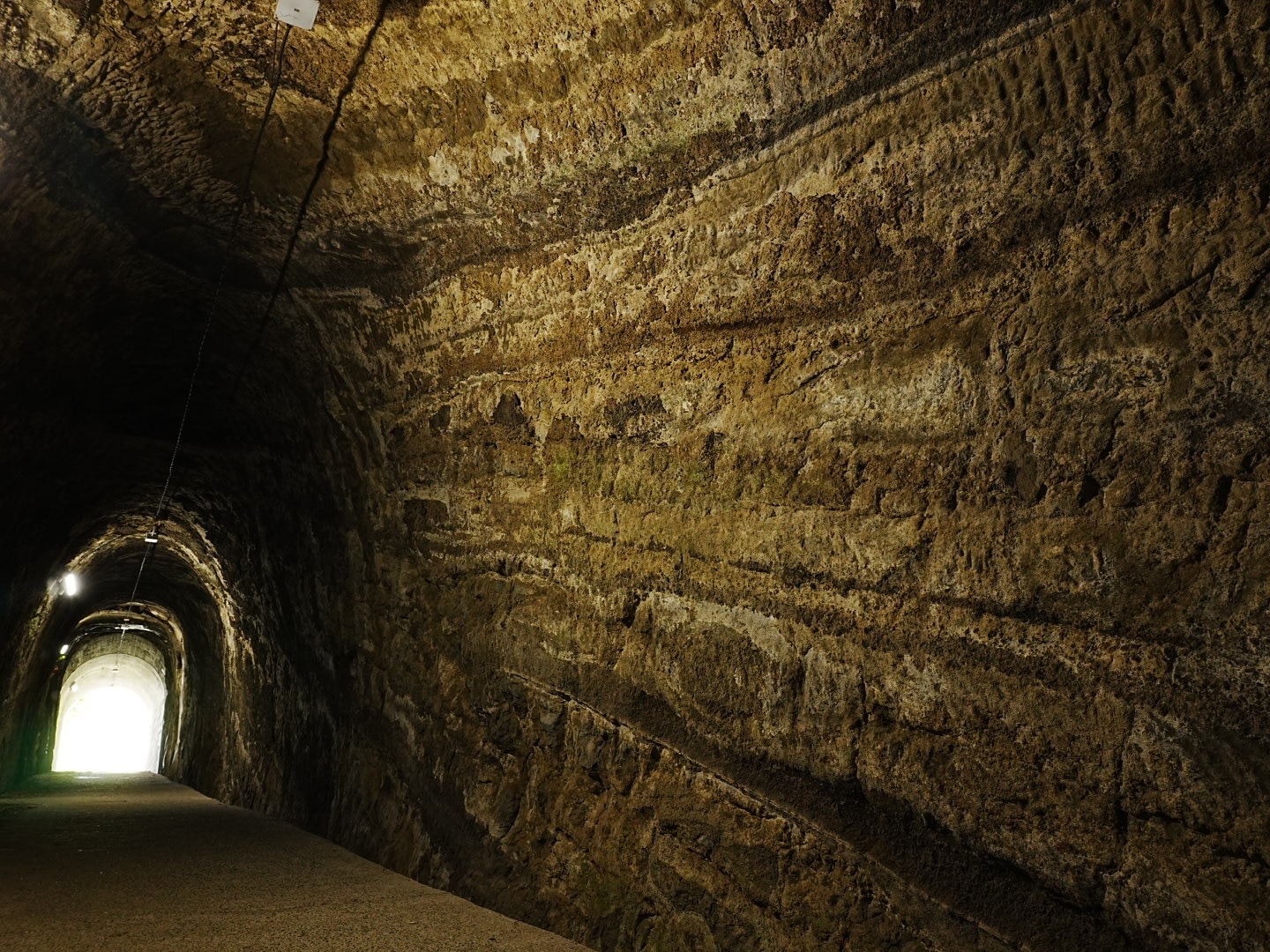 ▼たたら浜へ向かう途中に現れた素掘りのトンネル。地層がむき出しです! でも涼し~。ここを抜けると、たたら浜です。
