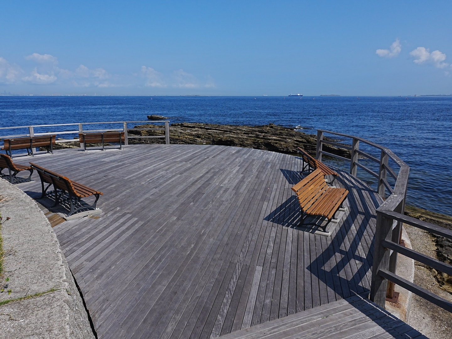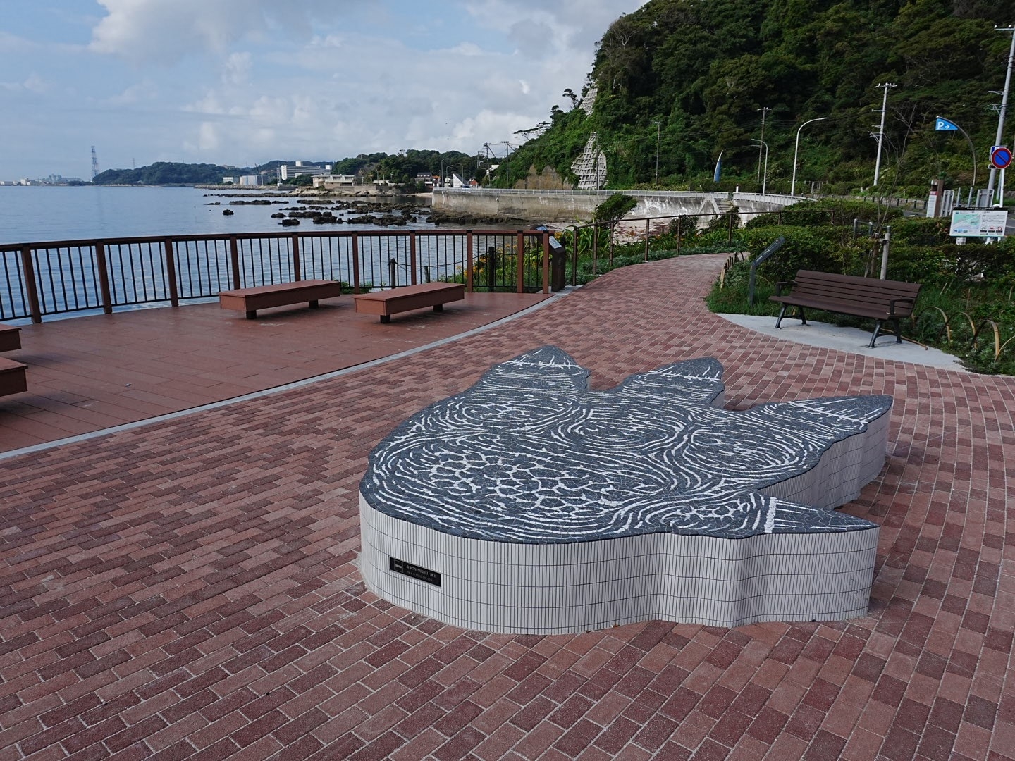 ▼今年の4月にリニューアルした「たたら浜展望広場」。ゴジラの足跡のモニュメントが設置されました。ちなみに、観音崎はゴジラが初上陸した地と言われていましたが、本当は"芝浦"とのこと。広場の手前には「観音崎自然博物館」があります。この辺りは、最近最終回を迎えたドラマの舞台となっていました。