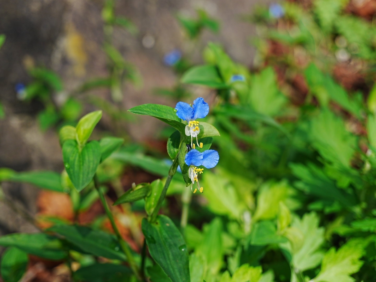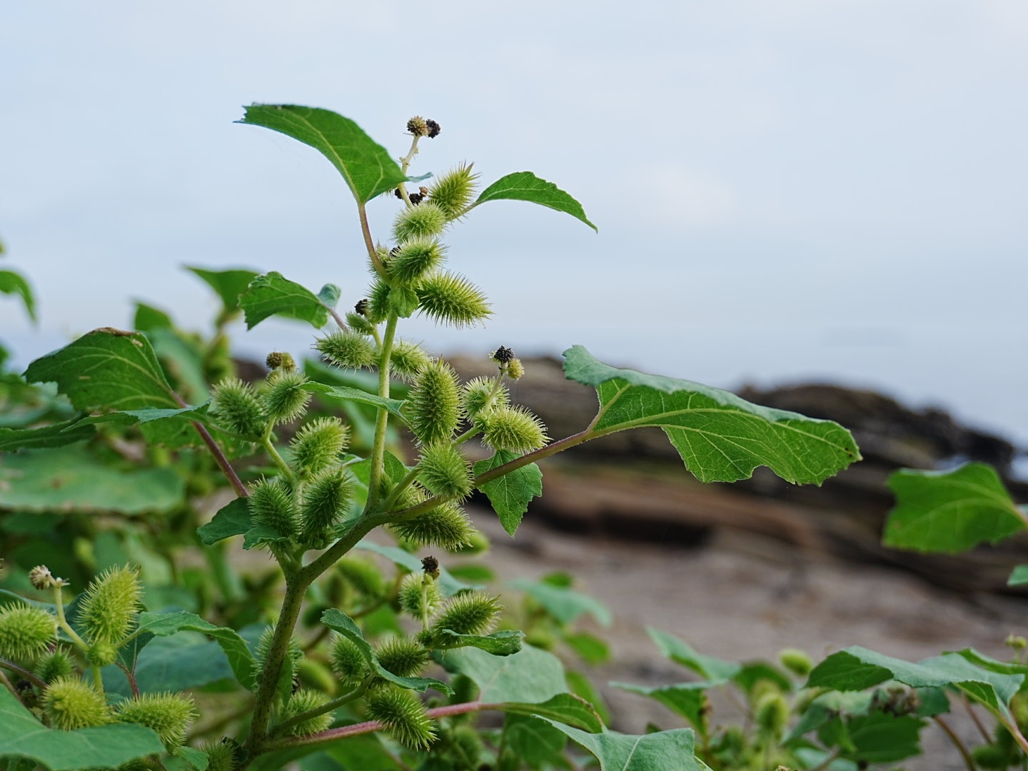 ▼たたら浜からは公園の内部に向かって歩きます(登りです)。途中、道端でツユクサを発見。青と黄色の色合いがキレイです♪ "引っ付き虫"ことオナモミ(写真はたぶん外来のオオオナモミ)も見つけました。