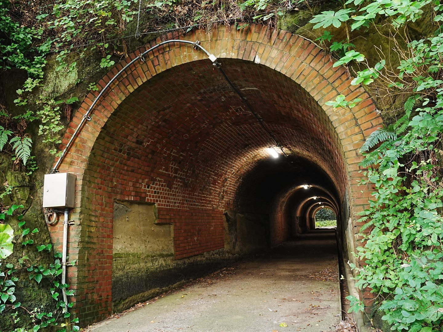 ▼観音崎第三砲台用通路として建設された隧道。積み方はレンガの長手(ながて)を並べた段と、小口(こぐち)を並べた段を交互に積み重ねる「イギリス積」(とのこと)。隧道の奥には「海の見晴らし台」があります。