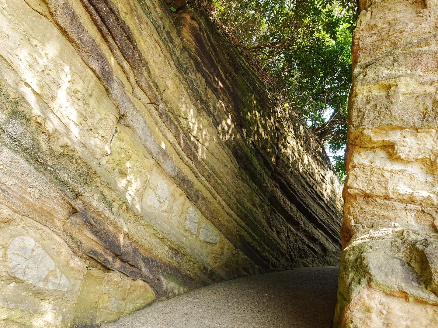 ▼観音崎公園を歩いているとよく見かける露頭(地層が地面に露出している部分)。ここは灯台のすぐ脇にある切り通し。このあたりは凝灰岩の層で「池子層」とよばれています。しま模様がとてもキレイ♪