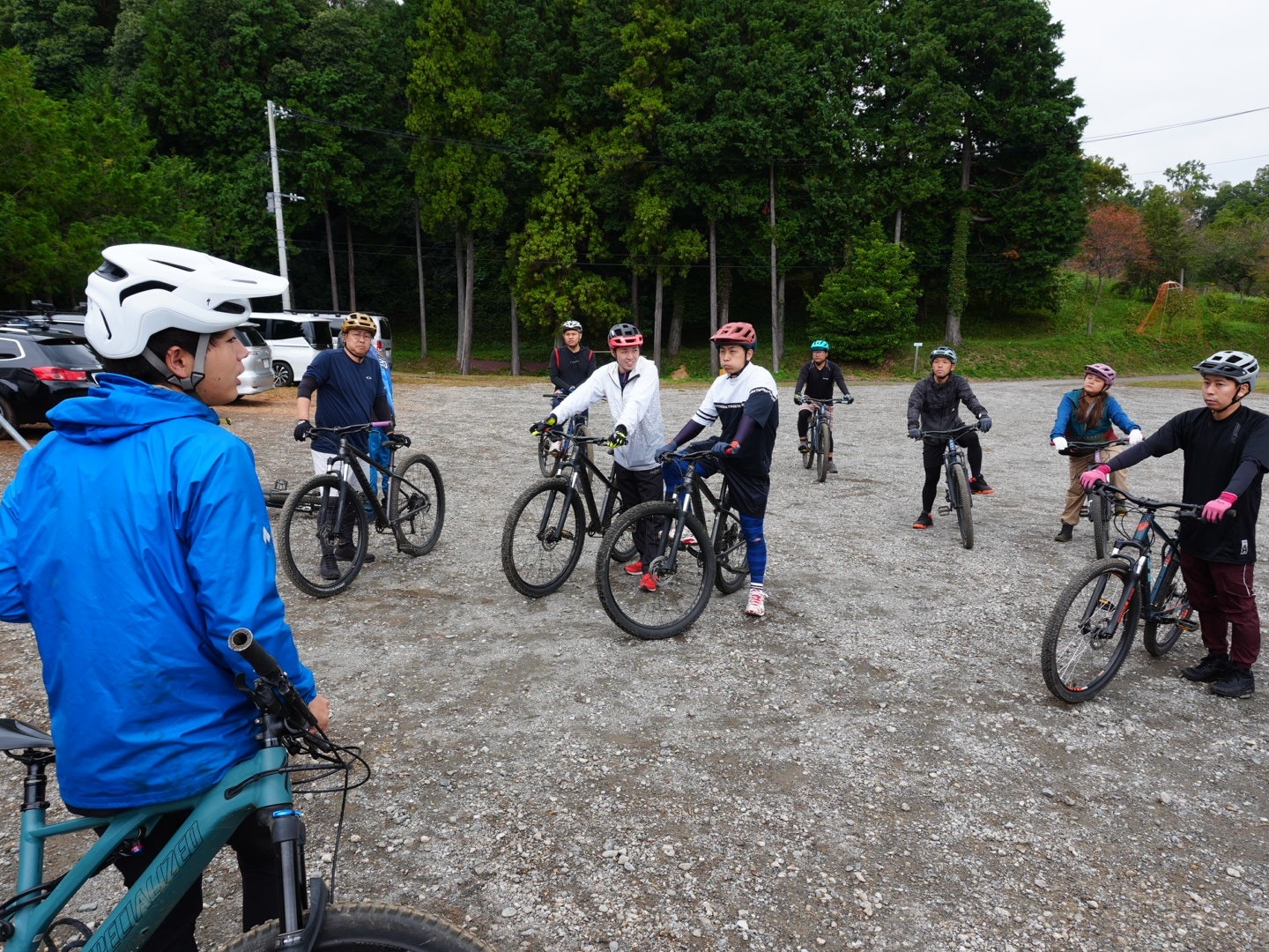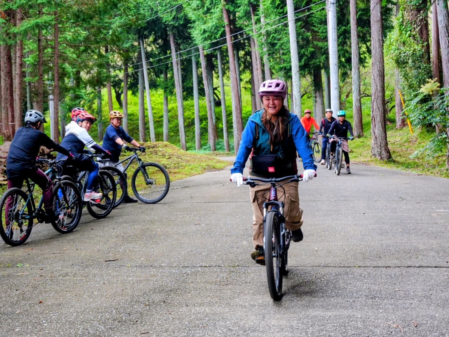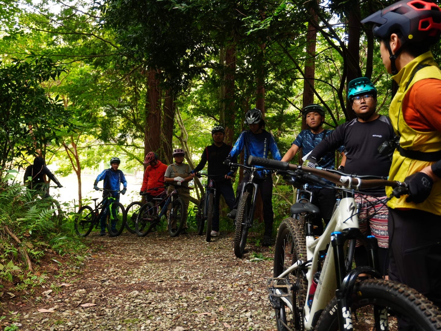 ▲いよいよトレイル(自然の地形を生かしたコース)に入ります。先頭はマイクスMTBコーナー:片野さん。片野さん以外の皆さんは、初めてのトレイルに緊張気味の様子。