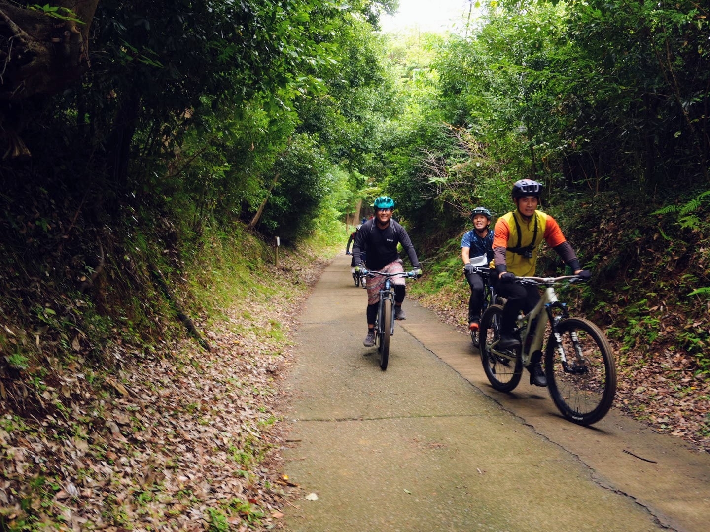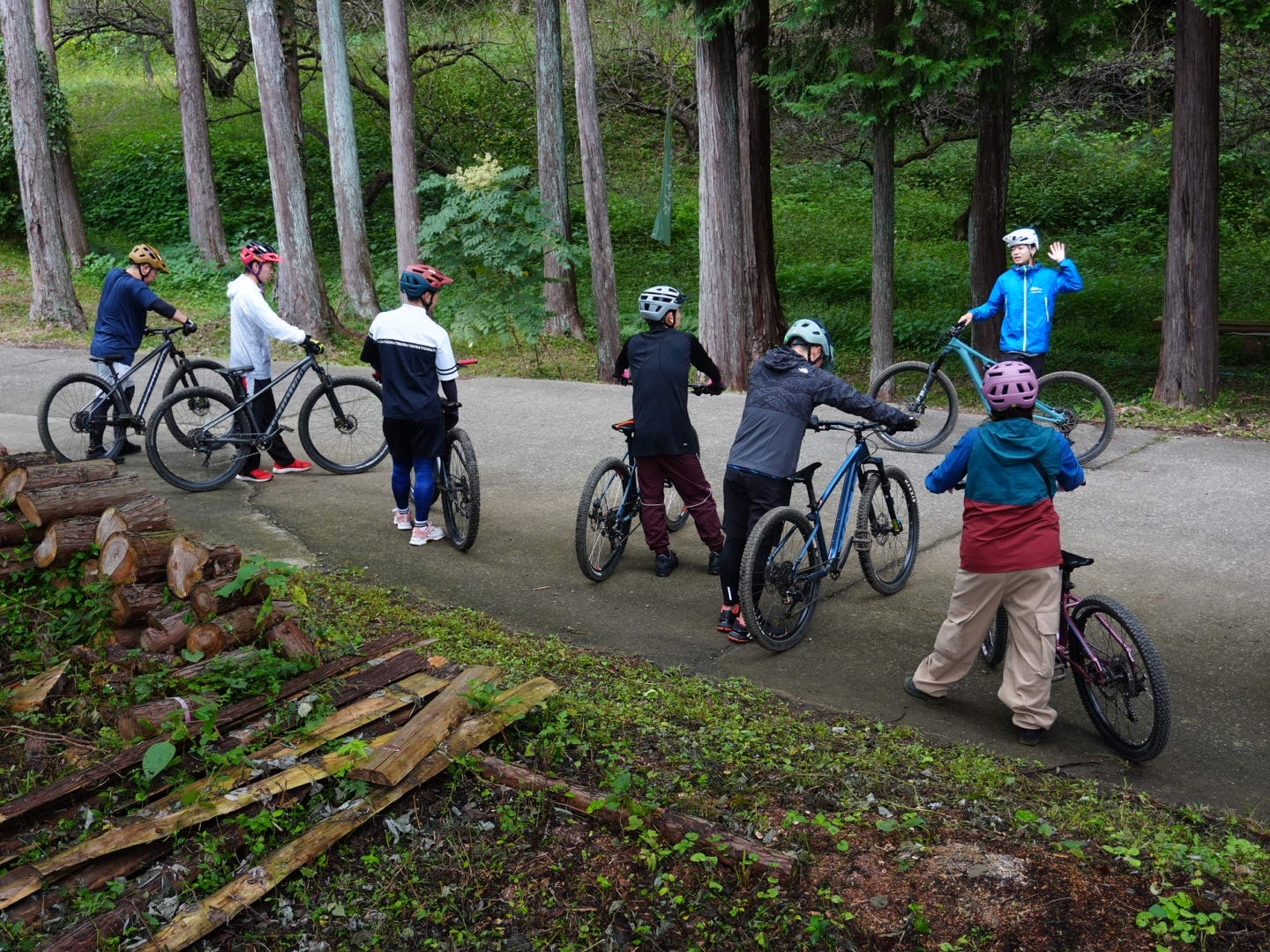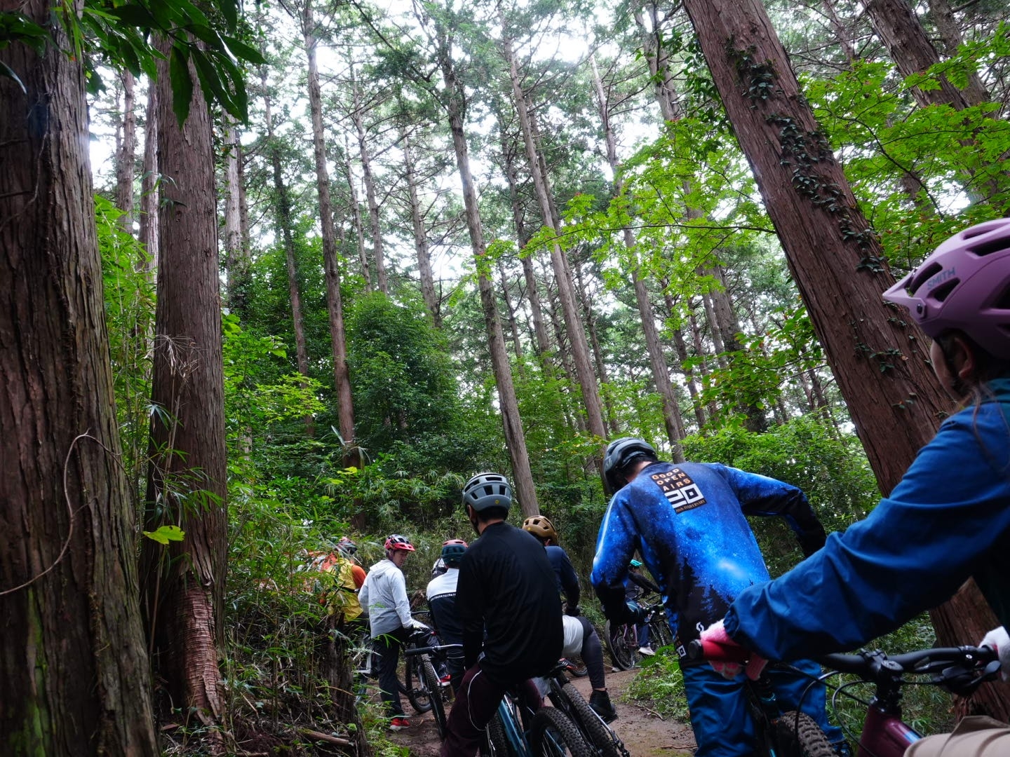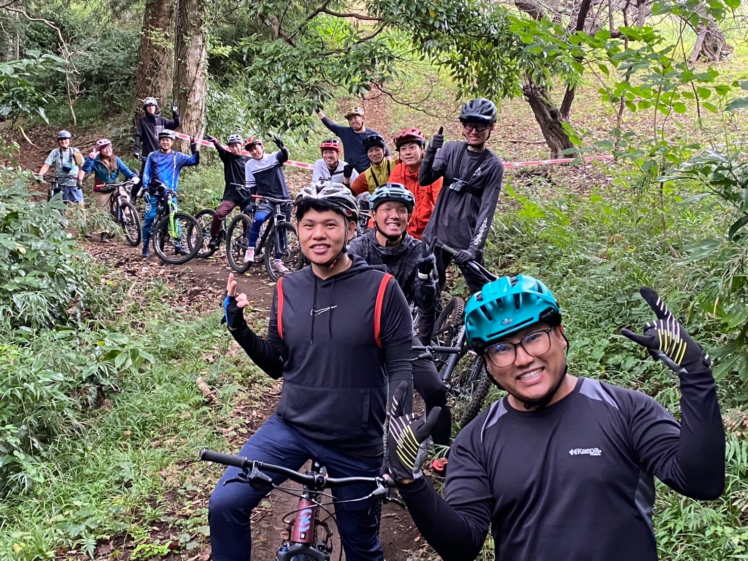 ▲いよいよトレイル(自然の地形を生かしたコース)に入ります。先頭はマイクスMTBコーナー:片野さん。片野さん以外の皆さんは、初めてのトレイルに緊張気味の様子。