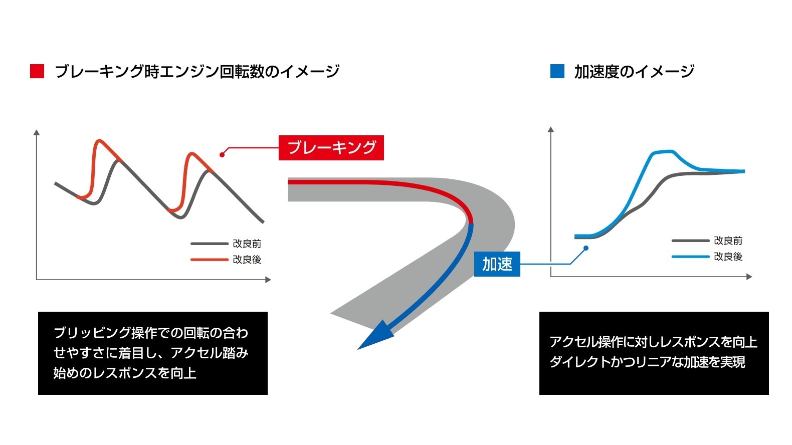 ブリッピング操作においてエンジン回転数を合わせやすいように変更。ワインディングでは「操作している感覚」がより濃くなります。ダイレクトな走りを実現しつつ、街乗りでも扱いやすい制御となりました。
