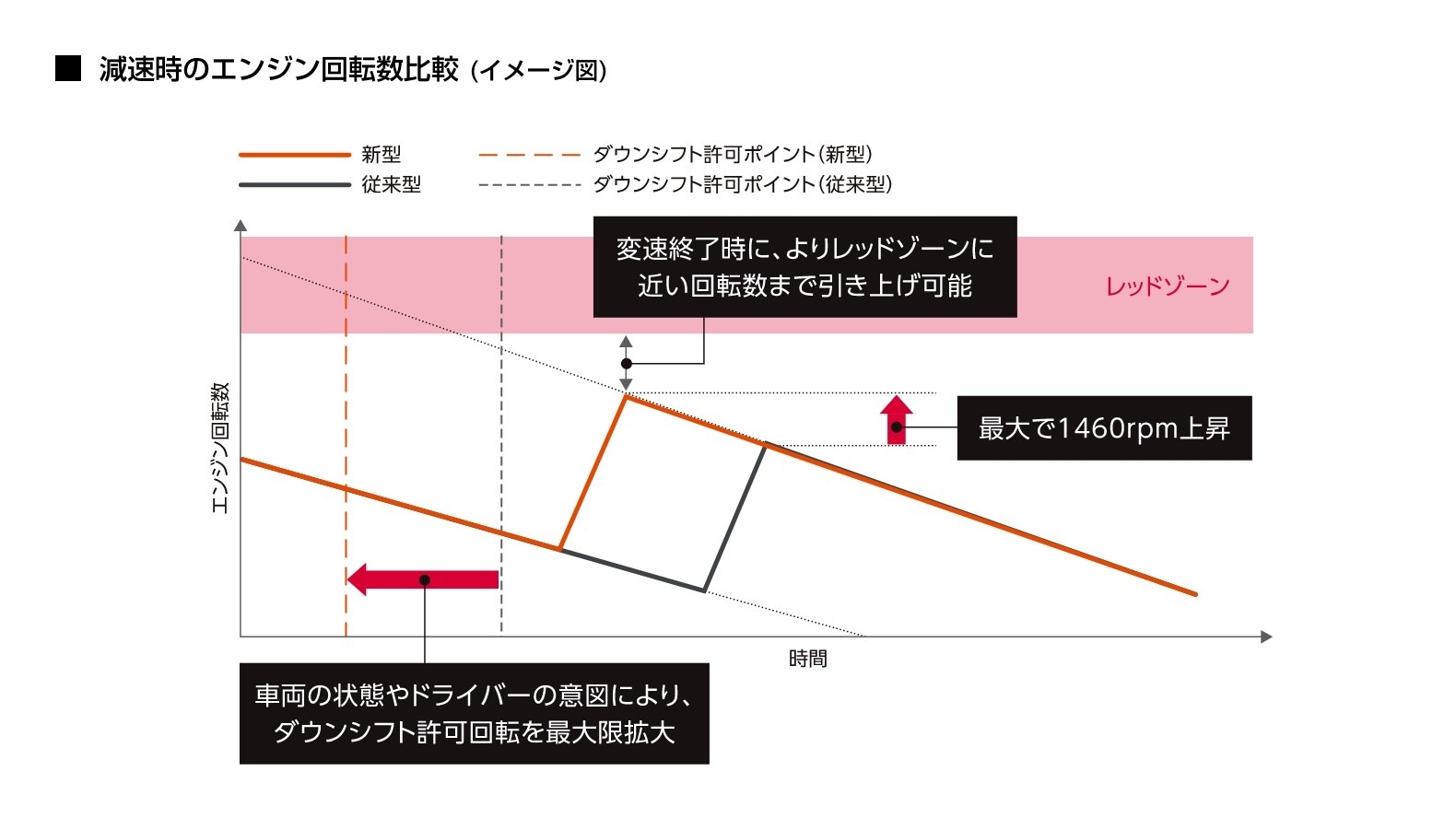 スロットル特性の変更(MT)、ダウンシフト操作時におけるエンジン回転数の許容範囲の拡大(AT)により、