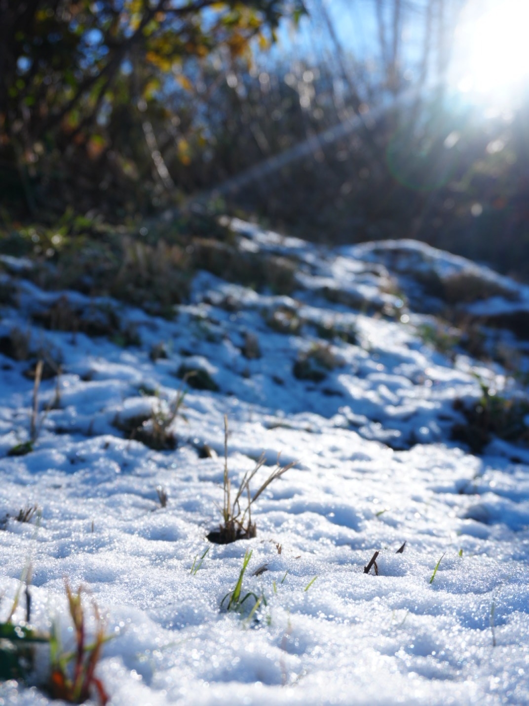 ▲1月2日の夜に降った雪が、近所の公園の斜面に残っていました。この後、子どもたちがきて、大騒ぎになっていました♪