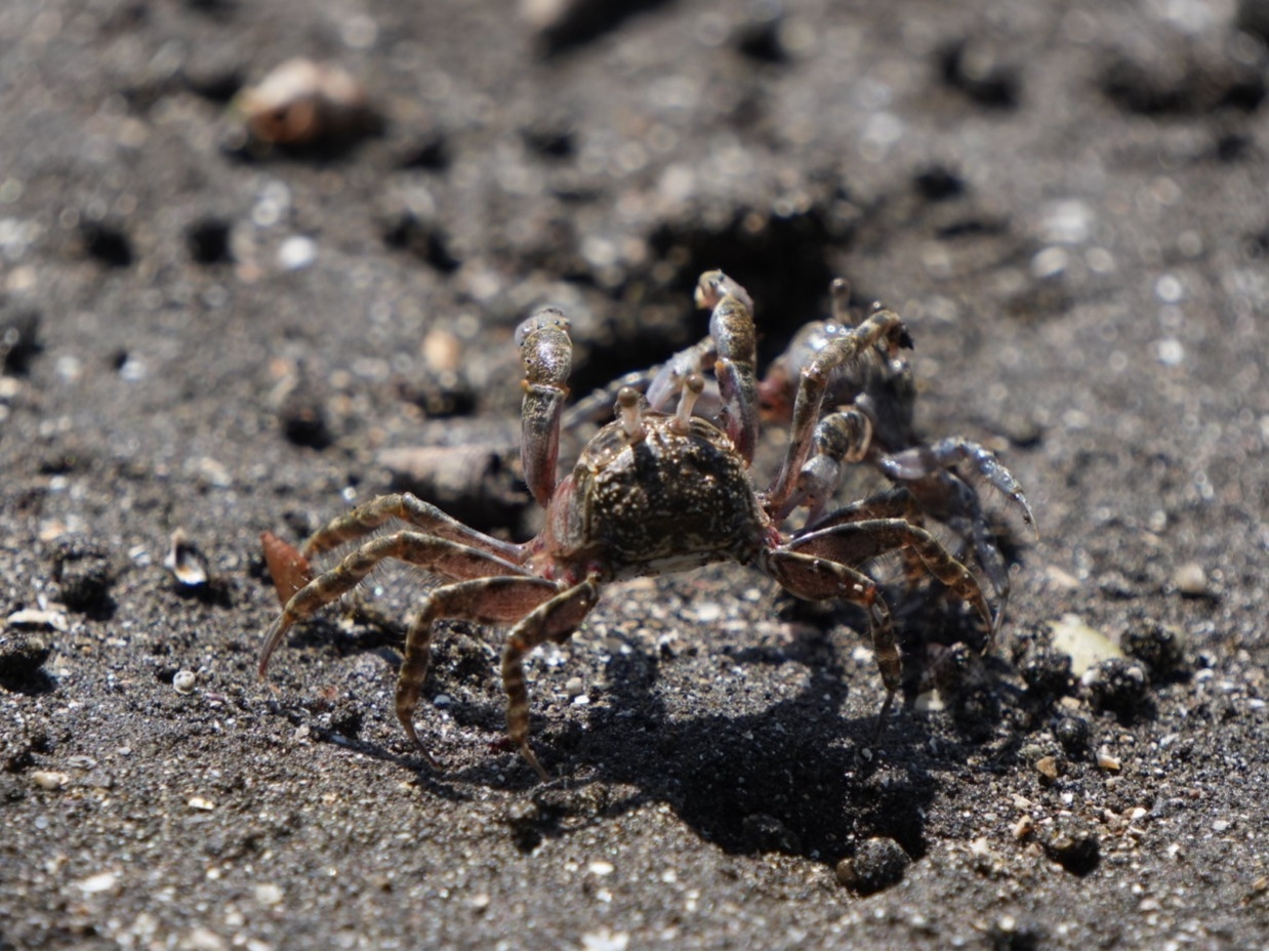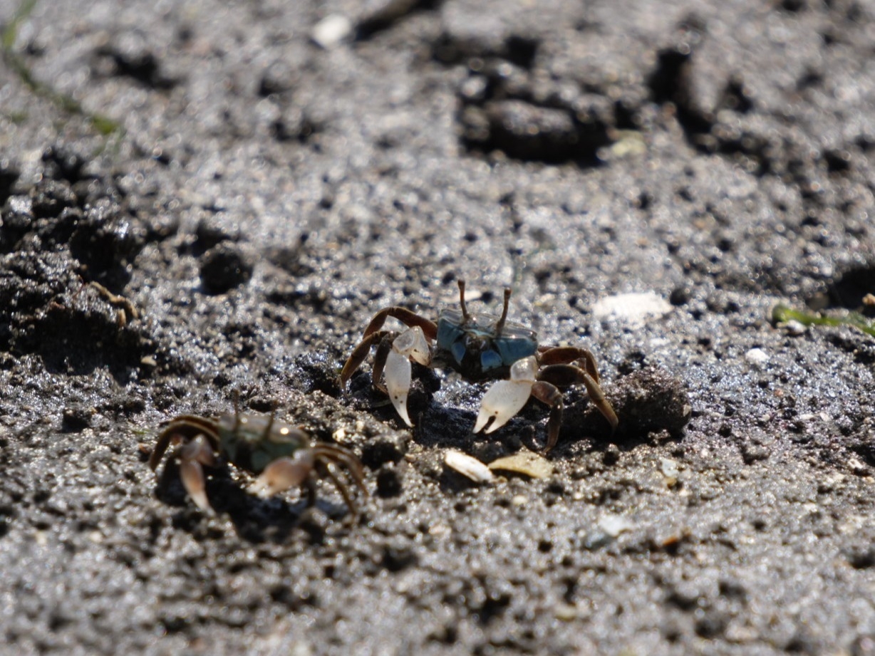 ▲入り口(引橋)から海までは、約1.5km。あちこち寄りながら歩くと、1時間以上かかります。干潟には「チコガニ(青い顔)」や「ヤマトオサガニ」が穴を出たり入ったり・・・。このカニたちを見ているだけで、充分に癒されます。