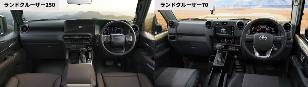 ランドクルーザー250、70ともに、水平基調のインストルメントパネルが特徴で、悪路でも車体の姿勢を把握しやすいのが魅力です。