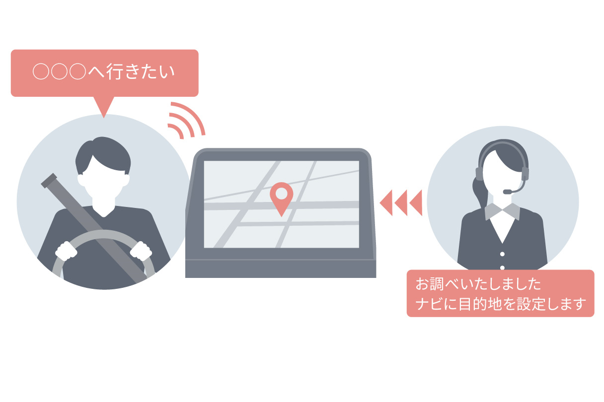 行きたい場所や知りたい情報を伝えるだけで、オペレーターがお客様に代わって検索し、ナビの目的地設定も行います。人ならではのきめ細かく柔軟な対応でご希望に沿ったサポート*2をいたします。