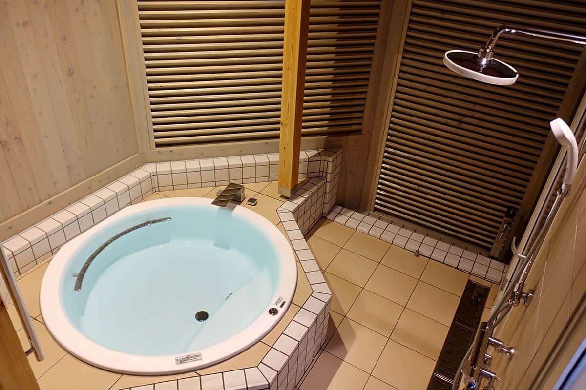 A.コテージ棟はシャワールームのみ、トレーラーハウス棟はシャワー+1人用の壺風呂を備えたバスルームがございます。また、個室貸切風呂を備えた浴室棟もございます。